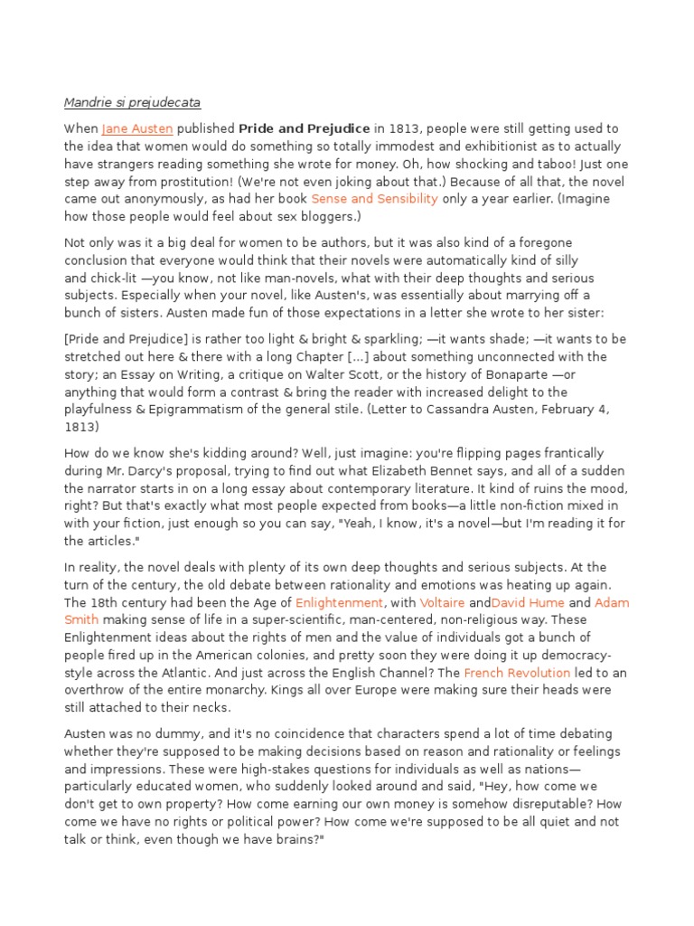 Ce mi a placut cel mai mult la mandrie si prejudecata si care nu putea fi redat in film a fost limbajul lui jane austen care m a impresionat profound. V am lasat deschisa sectiunea comentarii in acest sens. Academia edu is a platform for academics to share research papers. De asemenea daca ati citit cartea mandrie si prejudecata jane austen cateva pareri despre ea ar fi foarte utile.
