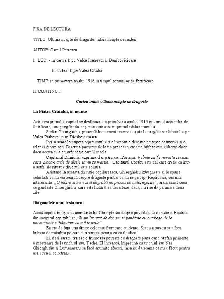 Fisa De Lectura Ultima Noapte De Dragoste Intaia Noapte De Razboi